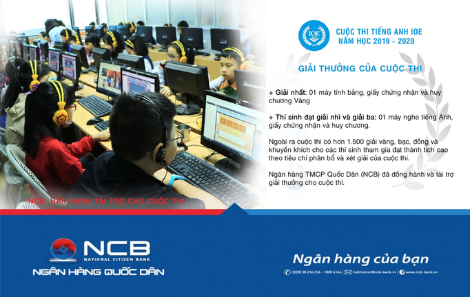 Bên cạnh đó, BTC cuộc thi cũng cảm ơn các Sở GD-ĐT, các Hội đồng thi đã cùng phối hợp tổ chức kì thi IOE năm học 2019 - 2020, cảm ơn Ngân hàng TMCP Quốc Dân (NCB) đã đồng hành và tài trợ giải thưởng cho cuộc thi IOE năm học 2019 - 2020 cùng các thầy cô, phụ huynh và các em học sinh đã hưởng ứng và ủng hộ Olympic tiếng Anh trên Internet (IOE).