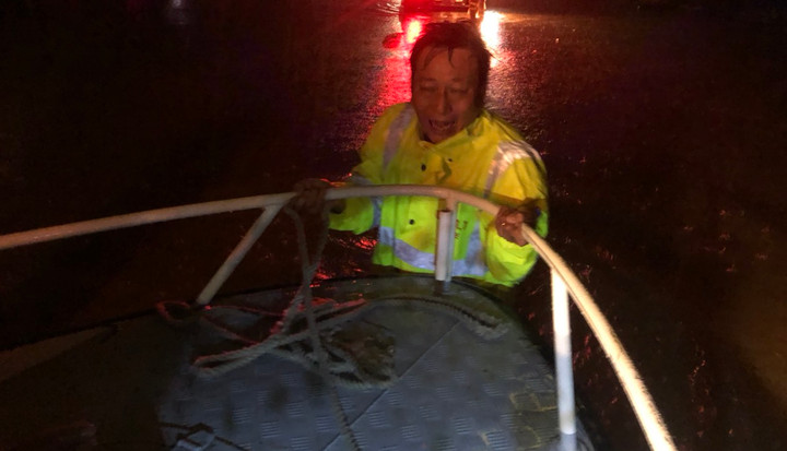 Cán bộ CSGT dầm mình trong nước lụt để đẩy ca nô tiếp cận người dân gặp nạn.