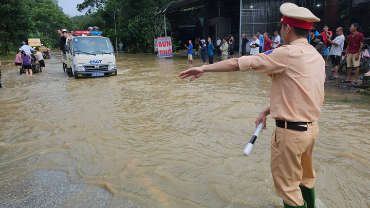 Lực lượng chức năng tiếp tục ứng trực để hướng dẫn giao thông, cắm biển cảnh báo khu vực ngập sâu, nước chảy xiết để người dân lưu ý.