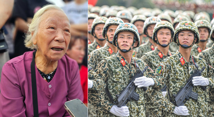 Giữa đám đông khán giả, cụ Khuất Thị Tâm (80 tuổi, quê ở Sơn Tây) nổi bật với mái tóc bạc, dáng người nhỏ nhắn và ánh mắt chăm chú dõi theo từng bước đi của các chiến sĩ. Cụ chia sẻ dậy từ 4h sáng để chuẩn bị, rồi nhờ con gái chở đến bằng xe máy để được xem trọn vẹn buổi tập luyện của các chiến sĩ. “Trước đây, tôi chỉ thấy diễu binh trên tivi. Nay được tận mắt nhìn, nghe tiếng giày, tiếng trống, lòng tôi rung động dữ lắm. Trời có nắng hơn nữa tôi cũng vẫn đi, có lẽ chỉ xem được lần này thôi!”, cụ Tâm nói.