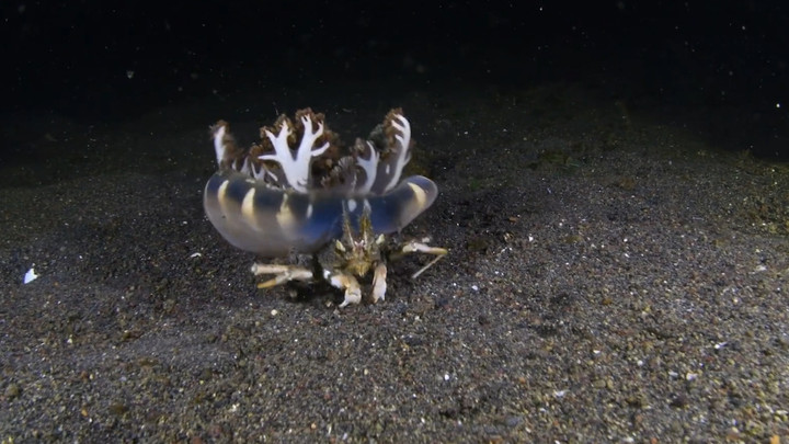 Chú cua thông minh đã đội con sứa trên đầu để ngụy trang thoát khỏi những kẻ săn mồi tại vùng biển Bali, Indonesia.