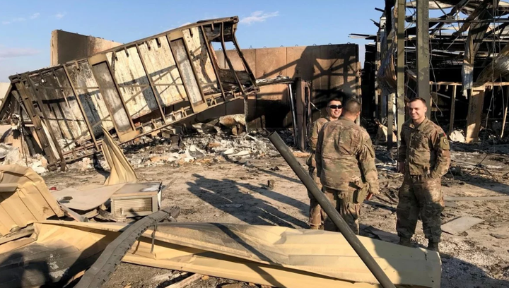 Lính Mỹ đứng trên đống đổ nát tại căn cứ bị Iran tấn công. (Ảnh: Reuters)