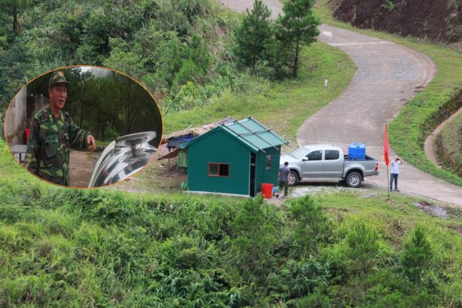 Sau hơn 30 phút men theo con đường quanh co, lên dốc, xuống dốc, nhiều khúc cua gấp qua bản Ngàn Chuồng (thị trấn Bình Liêu), chúng tôi có mặt tại khu vực sinh hoạt của các chiến sỹ chốt 1302. Bên ngoài căn nhà rộng hơn 15m2 nằm giữa đại ngàn là tấm tôn dựng vát nối một đầu với bình đựng nước.