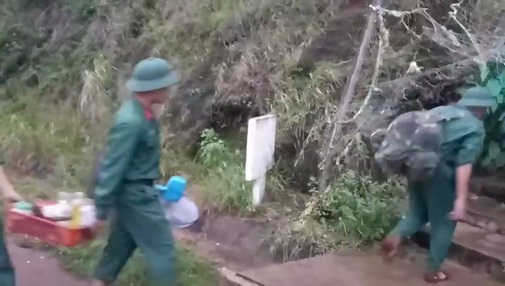 Lực lượng quân đội hành quân mang lương thực và các nhu yếu phẩm cần thiết vào hầm tránh bão.