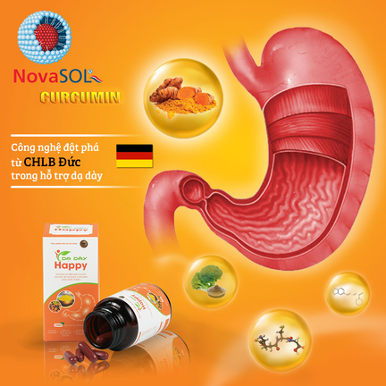 Viên uống Dạ Dày Happy bào chế dưới dạng nang dung dịch đảm bảo khả năng giữ được tính liên kết của cấu trúc Novasol và tăng cường độ ổn định của các phân tử trong quá trình giải phóng Curcumin.