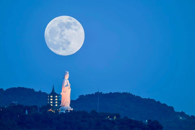 Hình ảnh mặt trăng to, tròn tỏa sáng rực rỡ phía trên tượng Bồ tát Quan Thế Âm tại Chùa Linh Ứng, Đà Nẵng được lan tỏa rộng rãi trên mạng xã hội. (Ảnh: Moon Black)
