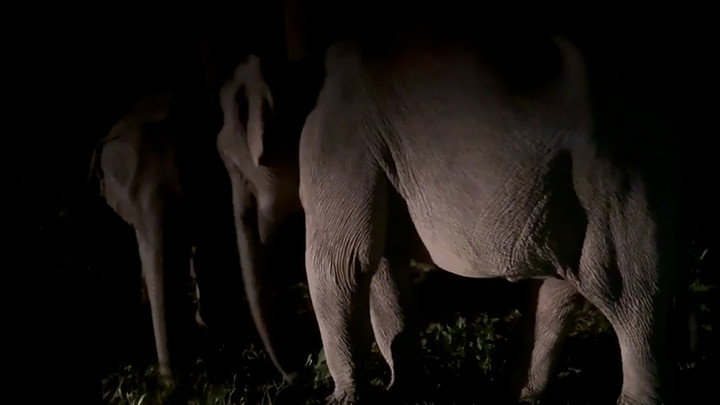 Đàn voi rừng bao vây một chiếc ô tô trên con đường vắng lặng vào ban đêm, một con voi dùng chân gõ vào cản xe, khiến hành khách bên trong hoảng sợ.