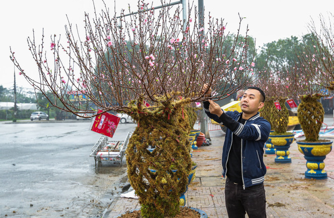 Những cây đào được uốn thành hình dáng chiếc lộc bình đang bày bán ở chợ cây cảnh lớn nhất Hà Tĩnh, mỗi chậu cây có giá 8-12 triệu đồng.