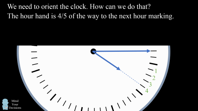 Trong chiếc đồng hồ trên, kim giờ đi được 4/5 con đường giữa 2 giờ, chứng tỏ kim phút cũng đi được 4/5 vòng tròn của mình.