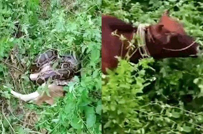 Bò mẹ đau đớn, bất lực khi chứng kiến con mình bị trăn khổng lồ nuốt chửng.