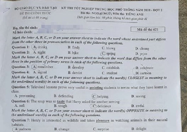 Các thí sinh hoàn thành đề thi môn tiếng Anh kỳ thi tốt nghiệp THPT 2020 trong thời gian 60 phút với 50 câu hỏi trắc nghiệm.