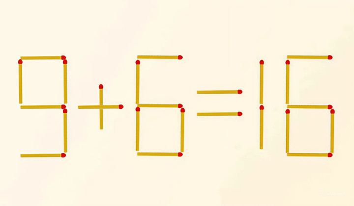 Các que diêm được xếp thành phép tính 9 + 6 = 16. Bạn hãy di chuyển một que diêm để phép tính từ sai trở thành đúng