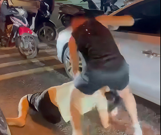 Nam tài xế áo đen liên tục đấm đá vào người còn lại. (Ảnh cắt từ clip).