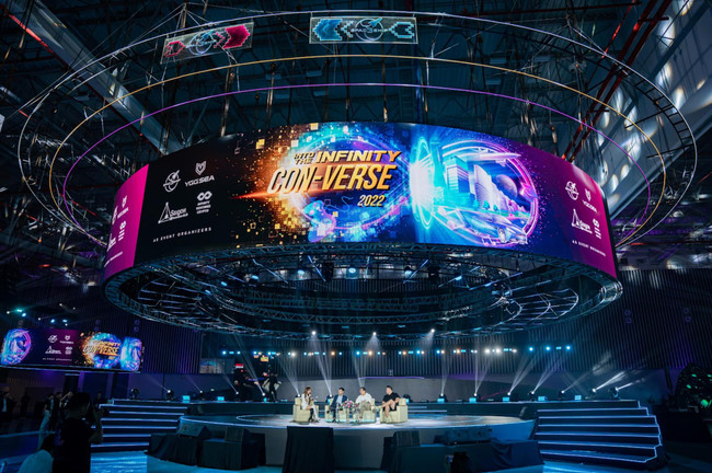Không gian của Blockchain và Metaverse được mô phỏng với màu sắc và hình khối 3D cùng 1.000m2 màn hình LED và màn hình cong 360o. Sân khấu trung tâm với thiết kế tàu không gian tạo nên một vũ trụ “ảo” giữa không gian thật vô cùng độc đáo.