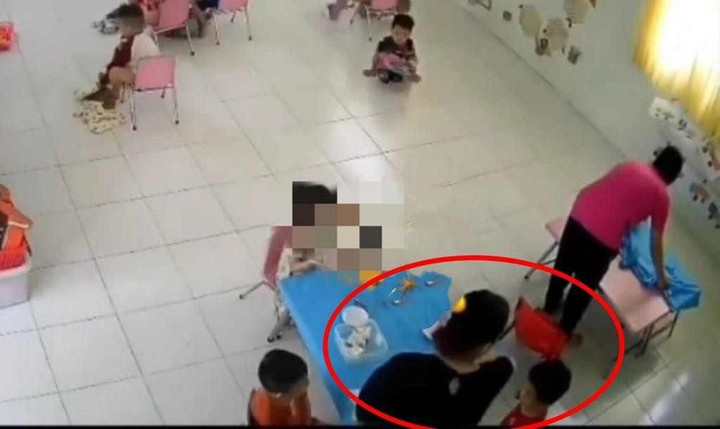 Cụ thể, video trích xuất từ camera của trường mầm non vào cuối tháng 3 cho thấy, sau giờ ăn trưa, chỉ còn 2-3 em vẫn đang ngồi ở bàn ăn, giáo viên này đã ngồi ở góc khuất camera để đút cho học sinh còn lại.