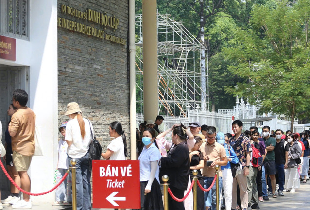 Ghi nhận tại Hội trường Thống Nhất (Dinh Độc Lập), không khí nhộn nhịp khi đông đảo người dân và du khách tìm đến tham quan. Khu vực cổng vào luôn đông kín người, nhiều người kiên nhẫn đứng xếp hàng chờ đến lượt mua vé để được vào bên trong khám phá công trình mang nhiều dấu ấn lịch sử.