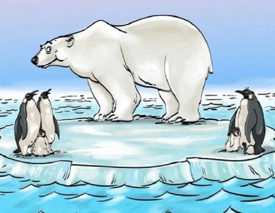 Tảng băng trôi khá nhỏ so với chú gấu bắc cực và các bạn chim cánh cụt, hãy cùng tìm ra điểm sai trong bức hình nhé.