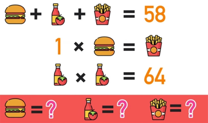 Bài toán đưa ra 3 món đồ (cái bánh, chai nước, khoai tây), với dữ liệu cho trước: cái bánh + chai nước + khoai tây = 58, 1 x cái bánh = khoai tây, và chai nước x chai nước = 64.