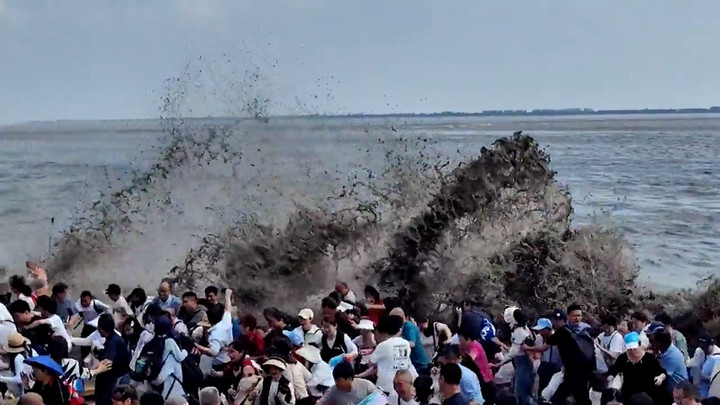 Hàng trăm du khách tập trung tại bờ biển ở Chiết Giang, Trung Quốc xem thủy triều, bất ngờ con sóng lón ập tới khiến nhiều người bị ngã.