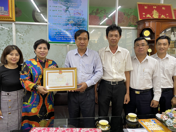 Ông Nguyễn Văn Nhu trao bằng khen của Chủ tịch UBND tỉnh Tây Ninh cho bà Lê Thị Giàu, Chủ tịch HĐQT Công ty cổ phần thực phẩm Bình Tây.