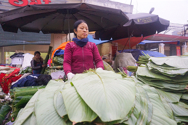 Khu chợ hoạt động đã trên 40 năm và chỉ bán duy nhất mặt hàng lá dong, những ngày giáp Tết Nguyên đán, khu chợ thêm tấp nập, hối hả.