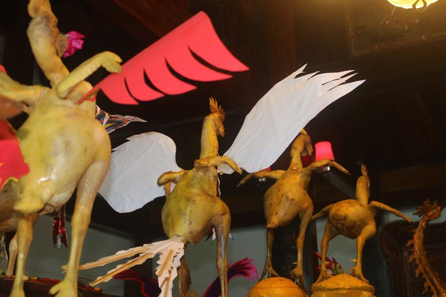 Những chú gà cúng được tạo dáng cầu kỳ, độc đáo tạo nên nét văn hóa riêng cho vùng quê này.