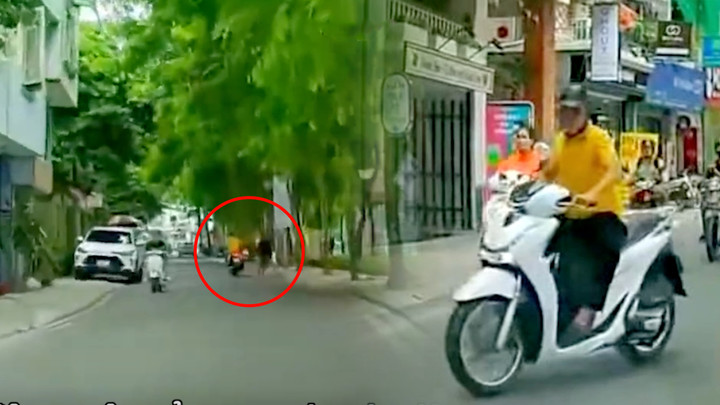 Trong lúc lấn làn, xe máy va chạm với một chiếc xe đạp. Sau va chạm, người đi xe máy liền lái xe quay lại, đạp người đi xe đạp ngã sõng soài xuống đường. Sau đó, tài xế xe máy tăng ga bỏ chạy.