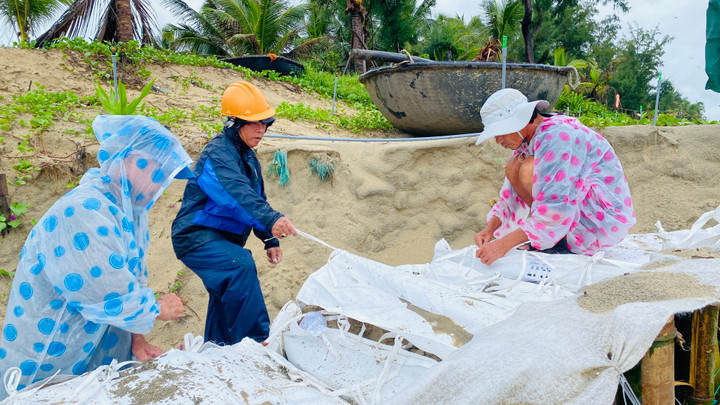 Đội cơn mưa nặng hạt, người dân Hội An, tỉnh Quảng Nam chạy đua với thời gian, dốc sức "vá" bờ biển trước khi áp thấp nhiệt đới đổ bộ vào đất liền.