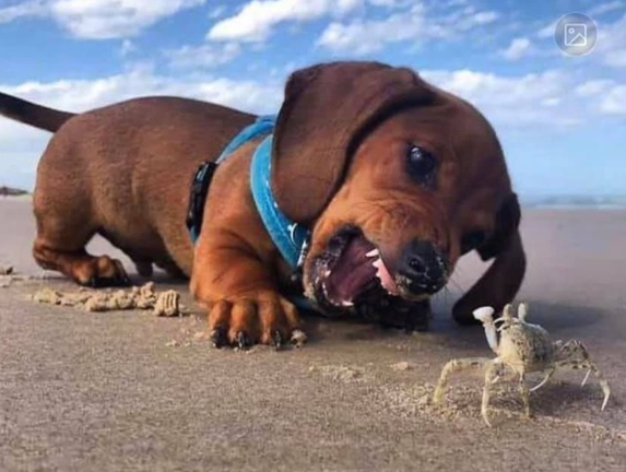 Thái độ gầm gè rất dữ tợn của chú cún trên bãi biển cho thấy "anh chàng" đánh giá rất cao đối thủ nhỏ bé của mình.