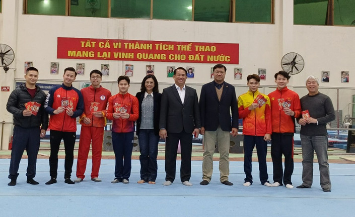 Hôm nay 12/2, ông Đặng Hà Việt - Cục trưởng Cục TDTT, ông Nguyễn Mạnh Hùng - Giám đốc Trung tâm Huấn luyện thể thao quốc gia Hà Nội và lãnh đạo Liên đoàn thể dục Việt Nam, Bộ môn Thể dục (Cục TDTT) tới thăm, chúc Tết đội tuyển TDDC đang tập huấn tại Trung tâm Huấn luyện thể thao quốc gia Hà Nội.