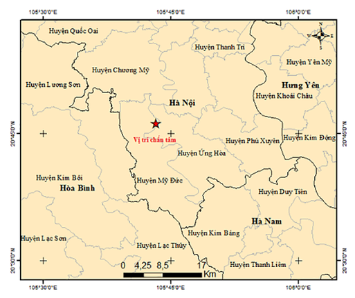 Viện Vật lý Địa cầu xác định, động đất xảy ra tại khu vực huyện Mỹ Đức, TP Hà Nội. Cấp độ rủi ro thiên tai cấp 0.