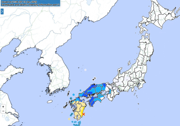 Trận động đất hôm 13/1 xảy ra ở ngoài khơi tỉnh Hyuga Nada, với độ sâu tâm chấn khoảng 36 km. Các nhà chức trách cũng quan sát được cơn sóng thần nhỏ cao khoảng 20 cm ở một số khu vực của tỉnh Miyazaki, trong khi một cơn sóng thần khác cao khoảng 10 cm ở một số khu vực của tỉnh Kochi.