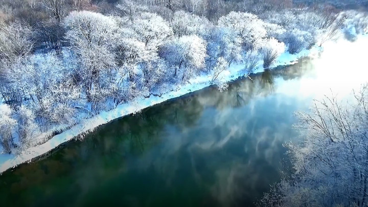 Con sông dài 20km ở miền bắc Trung Quốc không hề bị đóng băng dù nhiệt độ xuống tới -40 độ C, cây cỏ hai bên bờ sông bị tuyết trắng bao phủ.