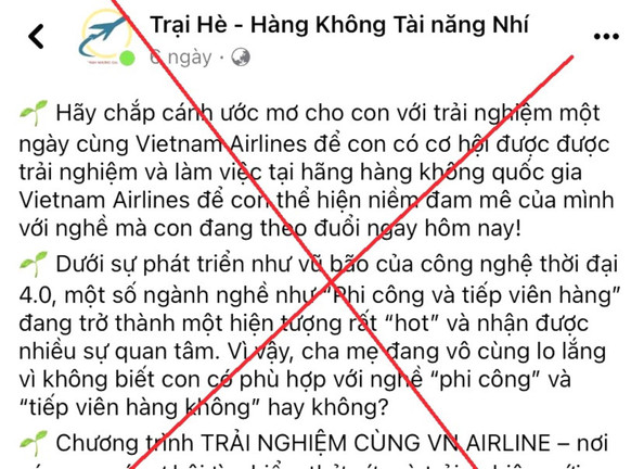 Theo trình báo, đầu tháng 8/2023, chị L. vào tài khoản mạng xã hội Facebook “Trại hè - Hàng không tài năng nhí” có hình ảnh cán bộ, nhân viên, máy bay, logo của hãng Hàng không Vietnam Airlines quảng cáo về việc trải nghiệm làm phi công cho bé nên đăng ký cho con.