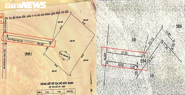 Hẻm đất (khoanh đỏ) là lối đi vào phần đất của ông Hiền được thể hiện ở Sơ đồ thửa đất, nhà ở và tài sản khác gắn liền với đất (hình trái), nay được cấp cho cá nhân ông Phan Thái Bình Dương sở hữu (hình phải).