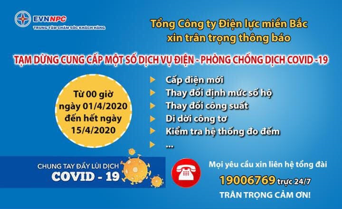 Tạm dừng việc cung cấp các dịch vụ điện liên quan đến cấp điện mới, các dịch vụ trong quá trình thực hiện hợp đồng mua bán điện; Niêm yết công khai trước cửa phòng giao dịch/các điểm giao dịch khách hàng, trên Website của đơn vị, báo đài địa phương, mạng xã hội để khách hàng biết, phối hợp cùng thực hiện. Trường hợp trong quá trình thực hiện hợp đồng nếu trong thời gian cách ly vẫn có yêu cầu qua các kênh gián tiếp, Đơn vị chủ động liên hệ để giải thích cho khách hàng biết và hẹn thời gian giải quyết sau khi hết thời gian cách ly.