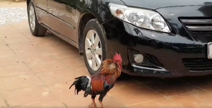 Nhìn thấy bóng mình trên thân xe bóng loáng, chú gà trống hung hăng xông vào cà khịa rồi đánh nhau với "đối thủ", mổ xước cả ô tô.