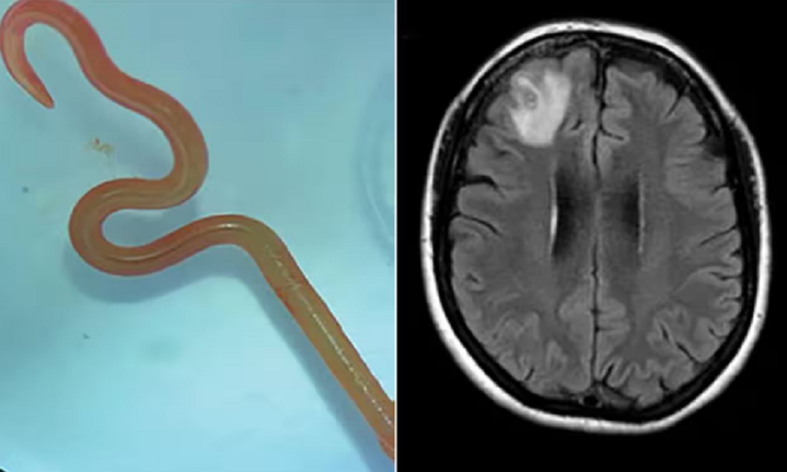 Cận cảnh con giun và vùng não thể hiện tình trạng bất thường ở bệnh nhân.