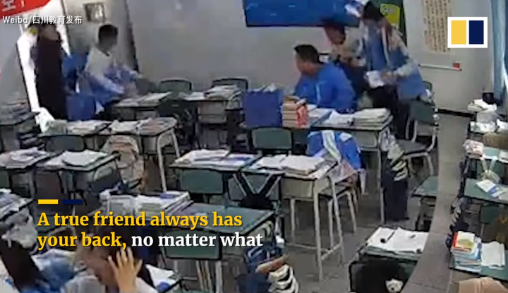 Trong đoạn video đang được chia sẻ chóng mặt trên mạng xã hội Trung Quốc, một học sinh thay vì lao ra khỏi lớp như bọn học đã chạy xuống phía cuối lớp.