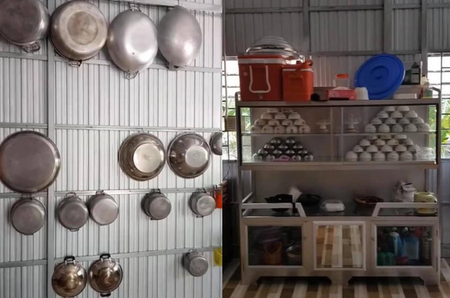 Căn bếp mộc mạc nhưng gọn gàng, sạch sẽ đến vô cùng. Những xoong nồi đã sử dụng cũng được lau chùi đến bóng sáng, sạch như chưa từng đụng đến lửa. Rổ rá cũng sạch tinh như mới. Tất cả đều được treo ngay ngắn, gọn gàng trên một vách tôn. Thậm chí, ngay cả sàn bếp có cảm tưởng bóng đến mức soi gương được.
