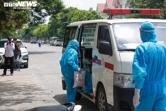 Khoảng 11h30, một chiếc xe y tế và một xe buýt của Công ty vận tải Hà Nội có mặt trước sảnh toà HH4C Linh Đàm để đón 1 F0 và 11 trường hợp F1.