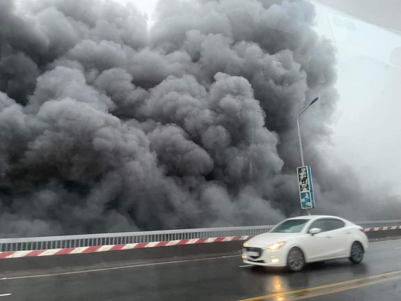 Lúc 7h15 ngày 7/2, nhiều tài xế đi qua cầu Thăng Long (Hà Nội) cho biết họ trông thấy cột khói đen bốc cao hàng chục mét.