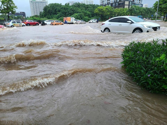 Trận mưa lớn do ảnh hưởng của bão số 5 khiến nhiều tuyến phố Hà Nội ngập sâu tới nửa mét, hàng trăm phương tiện không thể di chuyển đành nằm yên một chỗ.