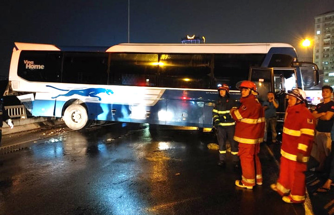 Hà Nội: Ô tô khách nổ lốp, tông đổ lan can, chắn ngang đường Vành đai 3 trên cao