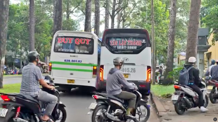 Ngày 11/8, trên mạng xã hội lan truyền đoạn clip ghi lại cảnh hai xe khách dừng chắn ngang đường Ngô Gia Tự, phường An Đông (TP.HCM), chiếm hết toàn bộ phần đường.