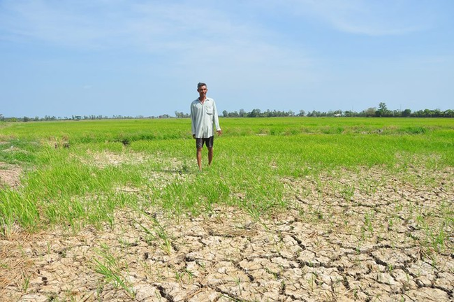 Ông Thạch Cường (53 tuổi, ấp Tân Quy A, xã Tân Hưng, huyện Long Phú, tỉnh Sóc Trăng) đã bơm nước từ sông vào ruộng để cứu lúa 1,5 tháng tuổi đang chuẩn bị giai đoạn làm đòng, tuy nhiên năm nay mặn xâm nhập sớm khiến đất nứt nẻ, không đủ nước cho lúa phát triển.