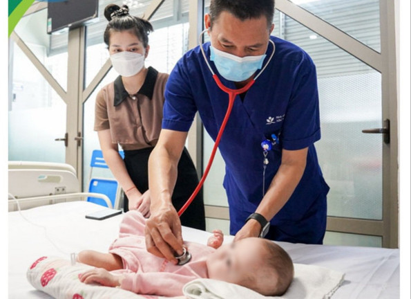 TS. BS Lê Hồng Quang, Phó Giám đốc Trung tâm Tim mạch, Bệnh viện Nhi Trung ương trực tiếp thăm khám cho bé P.S.