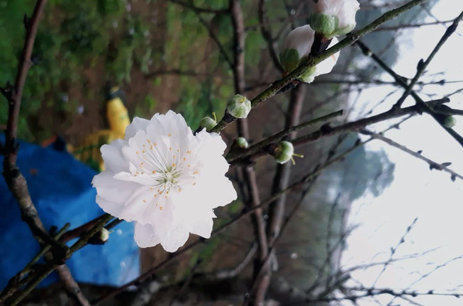Cây đào bạch gốc khá to, trên thân có rất nhiều hoa và nụ trắng muốt. Anh Thành kể: “Những năm trước, Tết đến dù ít hay nhiều nhà tôi đều ra chợ hoa mua một cây đào thế to, một cây quất đẹp. Nhưng năm nay, khi đang tham khảo đào bích trên mạng, tôi thấy có một nhà vườn ở Sơn La bán đào bạch rất đẹp. Thấy lạ mắt và bị hút hồn nên tôi đặt luôn một cây về chơi Tết”.