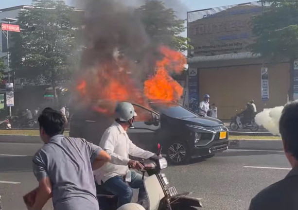 Chiếc xe lúc này bùng cháy dữ dội, người dân nhanh chóng dùng bình chữa cháy dập lửa.