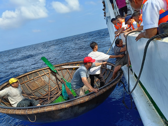 Tàu 467 Bộ Tư lệnh Hải quân tiếp cận đón 81 ngư dân và 2 thi thể ngư dân trong vụ tàu cá QNa 91029 TS bị chìm trên vùng biển Trường Sa.